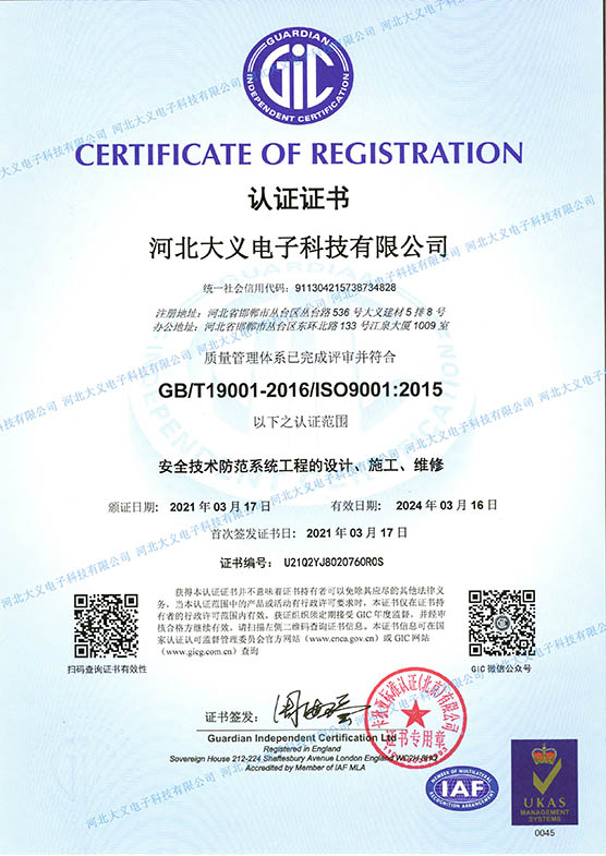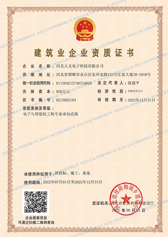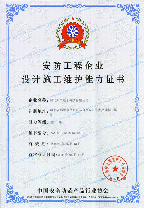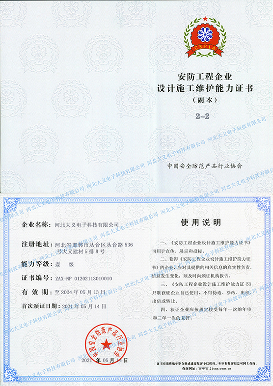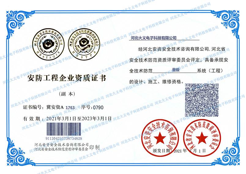 中國安防工程企業設計施工維護能力證書壹級,安全技術防范1級資質,建筑智能化工程專項承包貳級資質